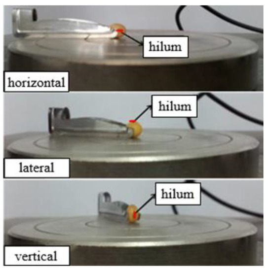The stiffness coefficients of the three varieties were measured using the compression test method [21,22]. As soybean seed particles are ellipsoidal particles with three unequal axes, their stiffness coefficients are different in all directions. Test measurements with three different placement methods (horizontal, lateral, and vertical) are shown in Figure 1. The average value was obtained and used as its final stiffness coefficient.