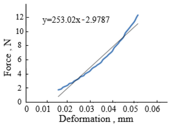 In our study, the deformation caused by collision during particle movement were within a small range of changes (0.01–0.05 mm) [21]. Therefore, the second section of the curve in the range of smaller deformations was analyzed and processed in this paper. This segment of data was processed in an Excel sheet and a straight line was fitted, as shown in Figure 3. The slope of this straight line is the stiffness coefficient of the soybean seed particles.