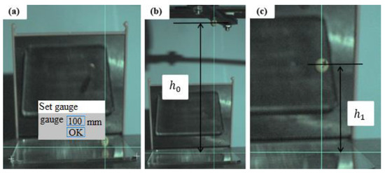 PCC image analysis process: (a) coordinate origin selection and distance calibration, (b) the distance between the initial position and coordinate origin of soybean seed particles, and (c) the distance between the highest point and coordinate origin of the first vertical rebound of soybean seed particles.