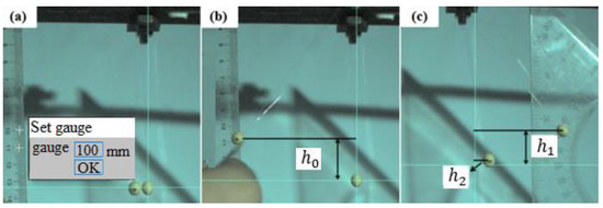where is the vertical distance between the initial position of soybean seed particles and coordinate origin, as shown in Figure 5b, and and are the distances between the highest point of the vertical rebound of the two soya beans and the origin of the coordinate after the first collision, respectively, as shown in Figure 5c.