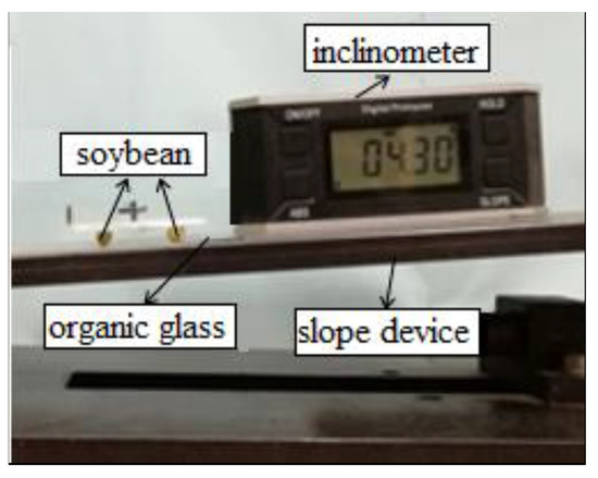 The method for measuring the static friction coefficient between the particles and boundary was the slope method [28,29]. Three soybean seed particles with an intact appearance were fixed on a small square glass plate with glue. The boundary material and inclinometer were fixed to the slope meter and the test material was placed on the boundary material, as shown in Figure 6. For the trials, three test specimens of each variety were used to produce three replicate experiments for each specimen. The specimens were made with the soybean in a random orientation with no fixed direction. The formula for the coefficient of static friction between the soya seed pellet and the boundary is shown below: