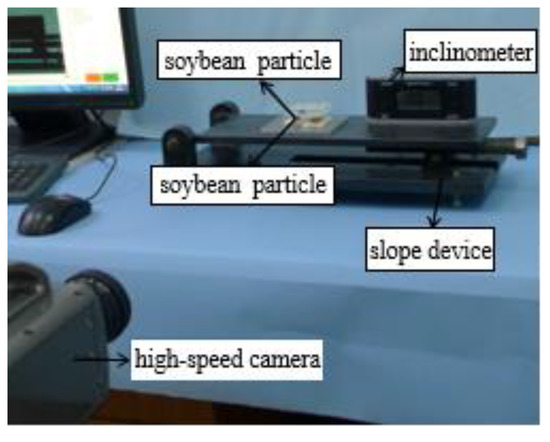 The slope method was used to measure the static friction coefficient between soybean seed particles. The test specimens were made by fixing three intact appearing soybean seed particles to a small square glass piece with glue. We fixed one specimen on the inclinometer and placed the other on top, to ensure that the two test soybean particles were in exact vertex contact, as shown in Figure 7. The equation for calculating the static friction coefficient between soybean seed particles is as follows: