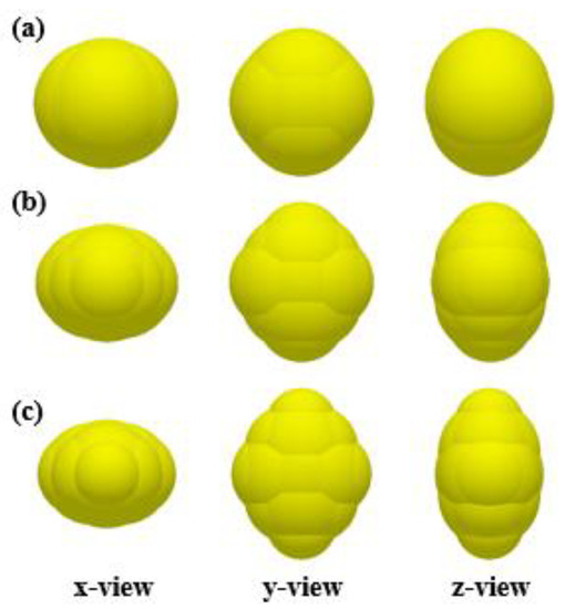 It was clear from our previous work that geometric models of soybean seed particles with different sphericities can be built by 5-, 9-, and 13-sphere models [19]. In this paper, two hundred grains of each variety were selected and measured to obtain the average triaxial dimensions, as well as the sphericity of soybean seed particles, as shown in Table 1.