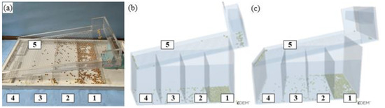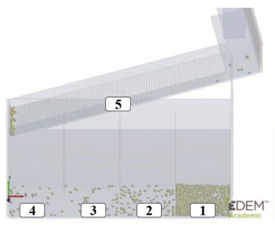 The test procedures were the same as in previous studies [19].The inclination angle and aperture sizes of the three varieties of self-flow screening simulation were 11° and 8 mm, respectively. The EDEM software with the parameters in Table 1 was used to simulate the self-flow screening test. In the simulation, 1000 particles were generated in the particle factory. After the particles were stable, we pulled out the insert plate, and the soybean particles moved downward along the sieve. At the end of the movement, the particles were present in the receiving area below or on the sieve deck. The numbers of soybean particles in the corresponding areas were counted and numbered as 1–5, as shown in Figure 10.