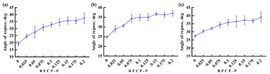 The relationship between angle of repose and RFCP-P for (a) SN42, (b) JD17, and (c) ZD39.