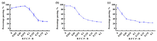 The relationship between percentage passing and RFCP-B is shown in Figure 12. For SN42, due to its high sphericity, the percentage passing did not change much when the RFCP-B gradually increased from 0 to 0.075, whereas the percentage passing tended to significantly decrease when the RFCP-B gradually increased from 0.075 to 0.2, with a range of 94.53 to 29.23%. For JD17 and ZD39, the percentage passing was significantly reduced as the RFCP-B increased, with a range of 95.43 to 26.4% and 86.97 to 23.53%, respectively. The analysis showed that the RFCP-B had a significant effect on the percentage passing. Therefore, an accurate RFCP-B needs to be calibrated by calibration tests.