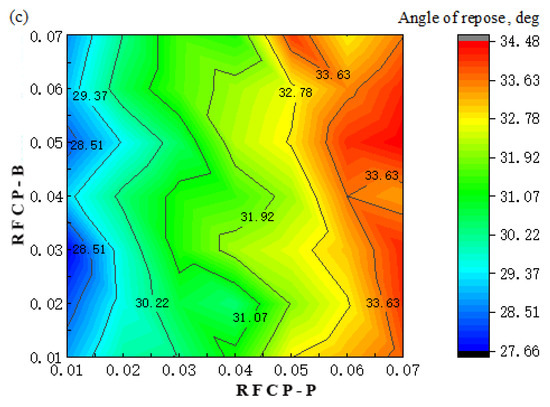 The results of the effect of RFCP-P and RFCP-B on the angle of repose for the three varieties of soybean seed particles are shown in Figure 13. For the three varieties, the effect of RFCP-P on the angle of repose was highly significant, whereas the effect of RFCP-B on the angle of repose was insignificant.