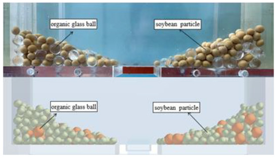 Test and simulation diagram of the repose angle of soybean seed particles mixed with organic glass spheres.