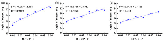 The relationship between the angle of repose and the RFCP-P for (a) SN42, (b) JD17, and (c) ZD39.