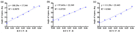 The relationship between the angle of repose and the RFCP-B for (a) SN42, (b) JD17, and (c) ZD39.