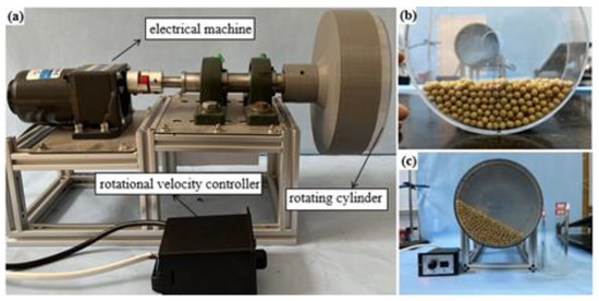 The rotating cylinder test apparatus is shown in Figure 17a, where the inner diameter of the cylinder is 160 mm and the height is 40 mm. Taking SN42 as an example, the soybean seed particles were first filled through the inlet, and when the height of the soybean seed particle filling in the cylinder reached 40–50 mm, it met the particle filling requirements of the rotating cylinder test, as shown in Figure 17b.