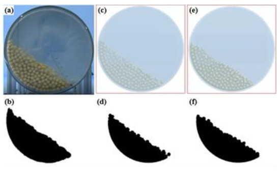 For the simulated rotating cylinder test, the soybean seed particle model was equal to the actual soybean seed particle mass. Taking SN42 as an example, the drum speed was 7.5 rpm. Figure 18a,b shows the test photo and binarization image, respectively. Figure 18c,d shows the simulation screenshot using the calibration parameters and binarization image, respectively. Figure 18e,f shows the simulation screenshot without considering the rolling friction coefficient and binarization image, respectively.