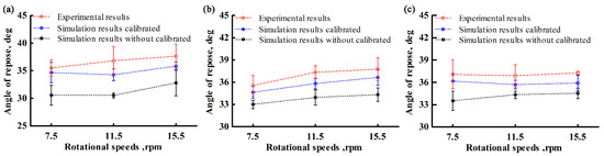 Figure 19 shows the dynamic angle of repose versus cylinder speed for each variety. For SN42, the relative errors between the simulation results using the calibration parameters and experimental results were 2.28, 6.93, and 4.78% for rotational speeds of 7.5, 11.5, and 15.5 rpm, respectively, whereas the relative errors between the simulation results ignoring the rolling friction coefficient and experimental results were 13.85, 17.08, and 12.83% for rotational speeds of 7.5, 11.5, and 15.5 rpm, respectively, as shown in Figure 19a.