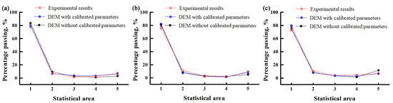 Comparisons of the simulation results with the test results of the percentage passing from different statistic areas in the “self-flow screening” for (a) SN42, (b) JD17, and (c) ZD39.