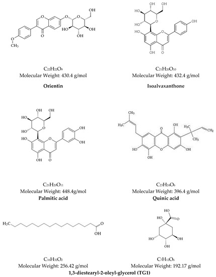 - Feitosa, C.M.; Santos, P.R.P.d.; Freitas, R.M.d.; Rodrigues, A.M.X.; Oliveira de, G.A.L.; Costa Junior, J.S.d.; Cavalcante, A.D.N. Ensaios pré-clínicos em ratos tratados com 1,3-diestearil-2-oleil-glicerol, constituinte isolado de Platonia insiginis. Consci. Saúde 2016, 14, 555–567. [Google Scholar] [CrossRef]