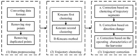 Wheat is one of the major food crops worldwide [15]. In the context of the global move toward digitalization in agriculture [16,17], research on wheat harvester trajectories is critical to the development of digital agriculture. Wheat harvest trajectories contain typical X-turn trajectories, and the study of wheat harvest trajectories can be extended to the study of harvest trajectories of other crops. Therefore, this paper uses GNSS equipment to obtain the driving trajectory data of real wheat harvesting agricultural machinery, identifying the wheat harvester’s turning trajectory, working trajectory, and abnormal working trajectory in a field. Specifically, the preliminary results of “working “ and “turning” trajectories are obtained by using the D-K-means method, that is, two K-means iterative clustering, and then a three-step correction is performed: