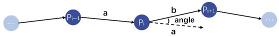 Schematic diagram of angle calculation for trajectory point . a is the vector between and , b is the vector between and .