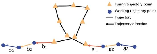 The distance feature of each trajectory point is used as the input feature in the second step of clustering, which is based on the previous step’s clustering results. After clustering, the “working” trajectory (recorded as label0) and “turning” trajectory (recorded as label1) are obtained. The data structure of the trajectory points is .
