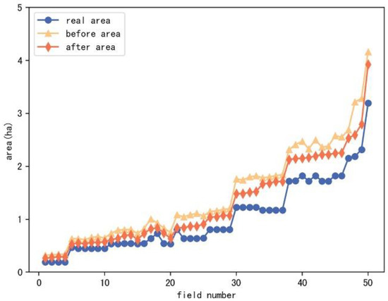 The distance algorithm is one of the ways to calculate the area of the field [25,26]. It is based on the principle that the width of the tractor multiplies the distance it travels. However, because the wheat harvester’s turning trajectory and abnormal working trajectory in the field overlap with the working trajectory, the calculated area does not match with the real field area. After identifying the trajectory of wheat harvester in-field, the distance algorithm is used to calculate the area after removing the turning trajectory and abnormal working trajectory, which effectively improves the accuracy of the area calculation result. As Figure 6 represents the real area, the calculated area before processing, and the calculated area after processing for the trajectory data of 50 fields, processing means removing the turning trajectory and the abnormal working trajectory, and it can be seen that the calculated value of field area is closer to the real area after processing. Additionally, the 50 fields’ real total area is 51.13 ha, their calculated area without processing is 73.10 ha, and their area after processing is 64.39 ha. The calculation error is reduced by 17.04%, and the error reduction was calculated as shown in Formula (9).