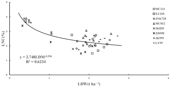 3.1. Construction of Critical Nitrogen Concentration Dilution Curve Based on Maize LDM