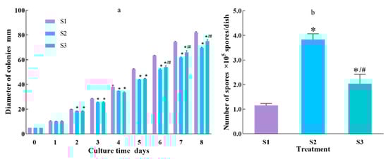 Figure 1a shows the colony growth of S1, S2 and S3 within 8 days. On the 8th day, the colony diameter of S1 was the largest, 15.22% and 8.47% larger than S2 and S3, respectively; S2 was 7.97% smaller than S3, and the differences between the three colonies were significant.