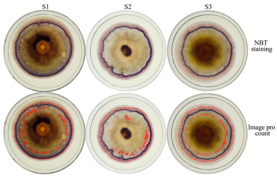 As shown in Figure 2, the three treatments produced O2−, and the edge colonies were particularly rich. The counting results of the Image-Pro software showed that the IOD/area values of S1, S2 and S3 were 0.086 a.u., 0.056 a.u. and 0.078 a.u., respectively, and the O2− production decreased by 34.88% after NADPH was inhibited, with it recovering after the addition of 0.0012% H2O2, as shown in S3.