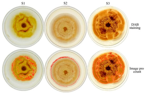 DAB staining photos of colony hydrogen peroxide. The upper row shoot in back light, the lower row is the Image-Pro software count picture. S1 group (n = 3): inoculation of F. solani on normal PDA; S2 group (n = 3): inoculation of F. solani on PDA containing 40 µmol/L DPI; S3 group (n = 3): inoculation of F. solani on PDA containing 40 µmol/L DPI. On the fourth day of cultivation, 5 mL of 0.0012% H2O2 was added to each dish.