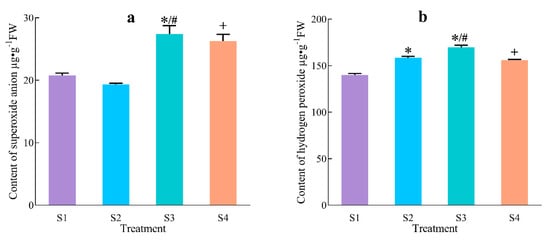 As shown in Figure 5b, the H2O2 contents of S1, S2, S3 and S4 were 139.96 ± 1.71 µg g−1FW,158.39 ± 1.64 µg g−1FW, 169.84 ± 2.09 µg g−1FW and 156.01 ± 0.87 µg g−1FW, respectively. Compared with S1, the H2O2 content of S4 increased 16.05 µg g−1FW. Compared with S2, the H2O2 content of S3 increased 11.45 µg g−1FW, and the increment was less than that without inhibitor.