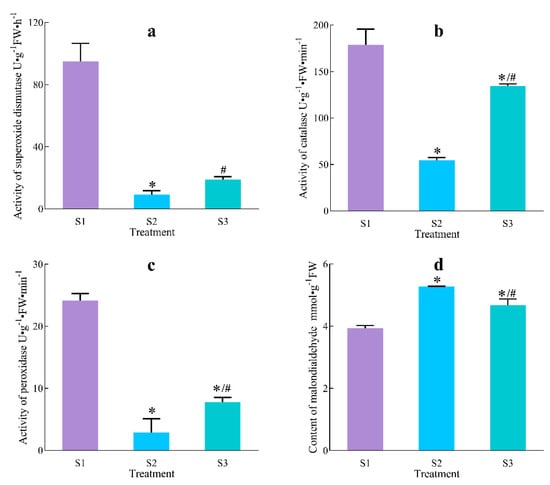 Compared with S1, the CAT activities of S2 and S3 were 69.51% and 24.91% lower, respectively. S3 was 59.40% higher than S2, with a significant upward trend (Figure 6b).