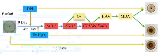 The addition of DPI and H2O2 can change the level of ROS in colonies, regulate the expression of NCF2 and its downstream genes SOD1, CTA1 and PXMP4 and change the activities of key metabolic enzymes such as SOD, CAT and POD and the level of MDA to change the degree of cell membrane oxidation and affect the growth of F. solani (Figure 7). In conclusion, the results provide a scientific breakthrough for further exploration of the interaction mechanism of NADPH oxidase, key ROS metabolic enzymes and MDA during the growth of F. solani.