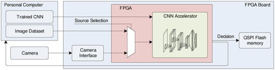 The main idea to start this work was the implementation of a tool for CNN deployment into embedded systems that enables us to place a pre-trained network into low-cost edge devices. In general, the complexity of the CNN configuration varies depending on the requirement for its application. Therefore, the manual implementation of various densities of CNNs on edge devices is a time-consuming process, especially when CNNs with different configurations need to be implemented and evaluated repeatedly on system on chip (SoC) devices based on the processing system (PS) and programmable logic (PL). To reduce the time for the design and coding procedure of an FPGA circuit, it is preferably to have a reconfigurable core for the CNN. All the settings for that CNN core can be transferred from the PC to ARM and then from the ARM processing subsystem to programmable logic without reprogramming the FPGA, but only updating the parameters in the CNN’s core. Usually, recompiling a new program file for FPGA takes up to a few hours; therefore, it is preferable to have a ready convolutional kernel housed in the FPGA and reconfigure it from the processing subsystem by submitting new weight arrays for the convolutional kernels and dense layers.