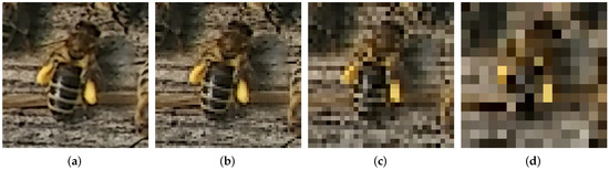 In the experimentation stage, we needed to evaluate the influence of the image resolution on classification accuracy. The lower the image resolution, the faster the classifier will work. However, the image resolution needs to be sufficient to keep the details of the pollen grains, especially knowing that the shape of the grains is not uniform. Figure 3a presents the quality of the image of the bee with pollen grains in a 1024 × 256 px raw image. The next three images (Figure 3b–d) were downsampled 2, 4, and 8 times, respectively.