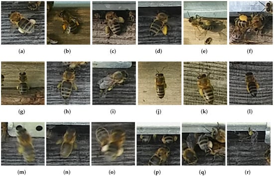 Figure 4. Bees at the entrance of the beehive: normal case with a grain pair (ac), a single pollen grain (df), tiny grains (gi), nestled grains (jl), blurred grains (mo), and partially obscured by the gate (pr).