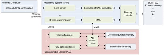 The top-level architectural diagram of the proposed CNN accelerator is presented in Figure 5. It is divided into two main functional blocks. The first block is the PS. The main purpose of the PS is the management of the data exchange between the personal computer (PC), external memory, and hardware accelerator. The second block is the programmable logic. It contains the hardware implementation of the CNN accelerator.