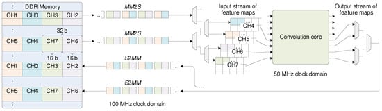 Figure 7. The stream of the input and output feature maps to/from the convolutional core on the PL.