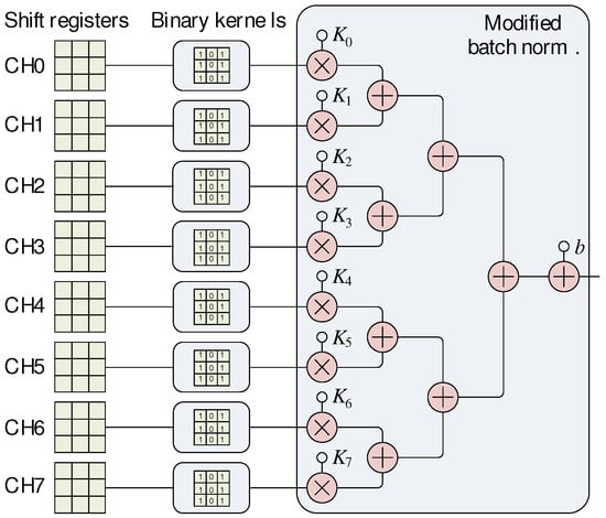 Figure 9. The 8-channel binary convolution and modified batch normalization block.