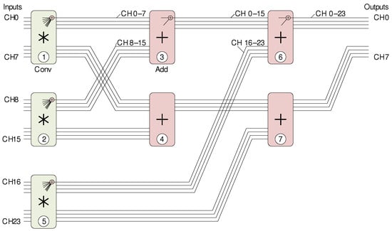 Figure 11. Core reconfiguration plan to process 24 inputs (channels CH0 to CH23) and obtain 8 output channels (CH0 to CH7). Green block—convolutional core, red block—same convolutional core configured for the sum operation.