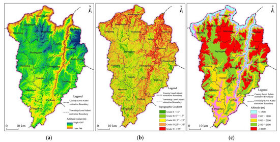 Results of topographic gradient and elevation classification in Luquan County. (a) The altitude map of Luquan County; (b) the topographic gradient grading map of Luquan County; (c) the elevation grading map of Luquan County.