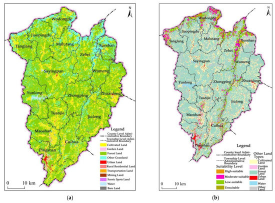 Results of land suitability evaluation of sorghum planting in Luquan County. (a) Present land-use map; (b) land suitability evaluation map.