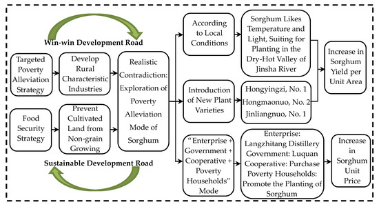 In order to win the battle against poverty, Luquan County, in accordance with the general requirements of the industrial development for poverty alleviation in the “five-pronged poverty alleviation measures”, takes industrial poverty alleviation as the primary work, and makes every effort to develop a characteristic planting industry to promote farmers’ income increase and poverty alleviation. In combination with the climate characteristics of the Jinsha River valley area in Luquan and the previous small-scale planting experience, since 2017 Luquan County has introduced new sorghum varieties Hongyingzi 1, Hongmaonao 2, and Jinliangnao 1, to the dry and hot valley region. Focusing on the fundamental poverty alleviation path of industrial poverty alleviation, it has taken sorghum planting as a key industrial poverty alleviation project, The Implementation Plan for the Development of Hig- quality Sorghum Industry in Luquan Yi and Miao Autonomous County (2018–2020) was formulated and issued. In the form of “enterprise + government + cooperatives + poverty households”, the “Langzhitang” liquor industry was introduced to settle in Luquan, build a factory, develop large-scale, industrialized and characteristic sorghum planting, and take policy measures to protect price acquisition, so as to promote farmers (especially poverty households) to increase production and income and promote industrial prosperity. Figure 5 intuitively shows the sustainable mode of poverty alleviation led by the sorghum planting industry in Luquan County.