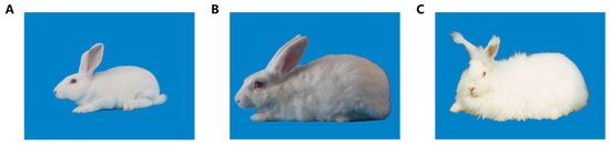 Different fiber length traits of three rabbit breeds. (A) Rex rabbit. (B) New Zealand rabbit. (C) Angora rabbit.