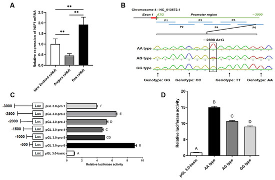 A single nucleotide polymorphism in the promoter region regulated the WIF1 gene expression in different rabbit breeds. (A) The mRNA relative expression level of the WIF1 gene among the Rex, New Zealand, and Angora rabbits. (B) The detection of single nucleotide polymorphism in the WIF1 promoter region. (C) The detection of luciferase activity of the WIF1 promoter region. (D) The analysis of luciferase activity of the different genotypes (AA, AG, and GG) in the WIF1 core promoter region. ** p < 0.05, values indicated with different letters (ABC) are significantly different. p < 0.05.