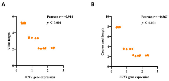 Pearson correlation analysis between relative expression of WIF1 gene and Villus, Coarse wool length in Rex, New Zealand and Angora Rabbits. (A) Pearson correlation analysis between relative expression of WIF1 gene and Villus length. (B) Pearson correlation analysis between relative expression of WIF1 gene and Coarse wool length. p < 0.001 indicates a significant difference. The range of the Pearson correlation coefficient is between −1 and 1. If the value of r is positive, it means a positive correlation. If the value of r is negative, it means a negative correlation. The closer the absolute value of r to 1, the higher the correlation degree.