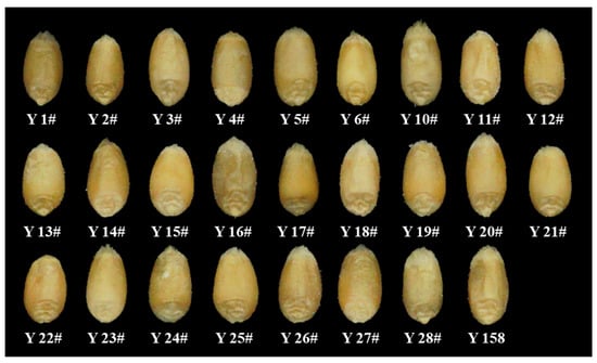 The materials used in the experiment were the Yangmai series varieties developed and supplied by the Institute of Agricultural Science in Lixiahe, Jiangsu Province, China. The test materials were divided into two groups according to different experimental purposes. The first group was a validation experiment, which included three varieties, namely Zhenmai No. 9, Yangmai No. 23, and Ningmai No. 13, each with 100 randomly selected grains. The second group was a test experiment and comprised 26 varieties of Yangmai series (Table 1), and 40 grains from each variety were randomly selected. Figure 1 shows the images of the wheat grains of different Yangmai series varieties.