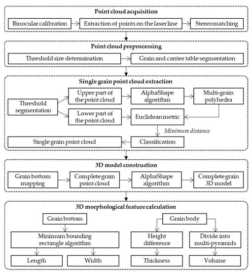 The overall processing pipeline of the grain point cloud is shown in Figure 3. It mainly includes 5 steps: point-cloud acquisition, point-cloud preprocessing, single-grain point-cloud extraction, 3D model construction, and 3D morphological feature calculation.