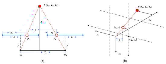 Figure 4. Principle of the binocular stereo imaging parallax. (a) Schematic of depth information; (b) schematic of XY information.