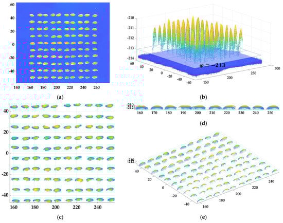 Grain point-cloud data extraction. (a) Top view of the original 3D point cloud; (b) northeast view of the grain and carrier point−cloud data segmentation; (c) top view of the extracted grain point cloud; (d) right view of the extracted grain point cloud; (e) northeast view of the extracted grain point cloud.