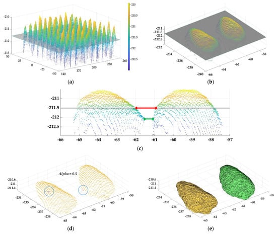 Usually, the thickness of the grain was not less than 2 mm, and setting the segmentation plane φ2 = −211.5, which allowed for the easily splitting of the grain point cloud into two parts: the upper and lower parts (Figure 6a,b). As can be seen in Figure 6c, the red line distance is larger than the green line distance, which ensured that the right radius was used to categorize the different grain point clouds. Setting the Alpha shape radius α = 0.5, which could accurately cluster the grain point clouds of the same category together (Figure 6d). Thus, the upper part of the grain point cloud was grouped into different polyhedra (Figure 6e) to extract the upper part of a single grain point cloud. For the lower part of the point cloud, classifying the point to its nearest polyhedron and repeating this until the ending classification of all of the lower parts of the point cloud (Figure 7).