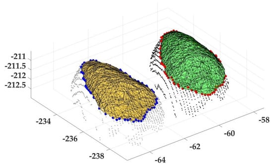 In the experimental environment, the grains were spaced apart and split from each other more easily. However, there were also cases of grain adhesion. Therefore, we partitioned between grains under more extreme conditions to obtain more reliable single grain. First, setting a segmentation plane threshold φ2 to split grain point cloud into two parts: the upper and lower parts. Second, the AlphaShape function method for constructing polyhedra from points was used for the upper part []. By setting the Alpha shape radius value, the upper part of grains could be clustered into different polyhedra. Final, for the lower part of the point cloud, each point was classified to its nearest polyhedron.