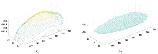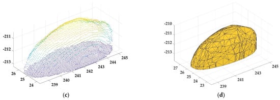 All the grain point-cloud data were taken from the grain frontal scan. To construct a complete 3D grain body, the grain bottom needed to be obtained. Using overhead projection to project all grain point clouds to the height level of the carrier table, which could simulate the bottom of the grains (Figure 8b). Combining it with the bottomless point cloud (Figure 8a) to obtain a complete grain point cloud (Figure 8c). Again, setting the Alpha shape radius α = 0.5, which clustered all point clouds into a complete 3D model of the grains (Figure 8d).